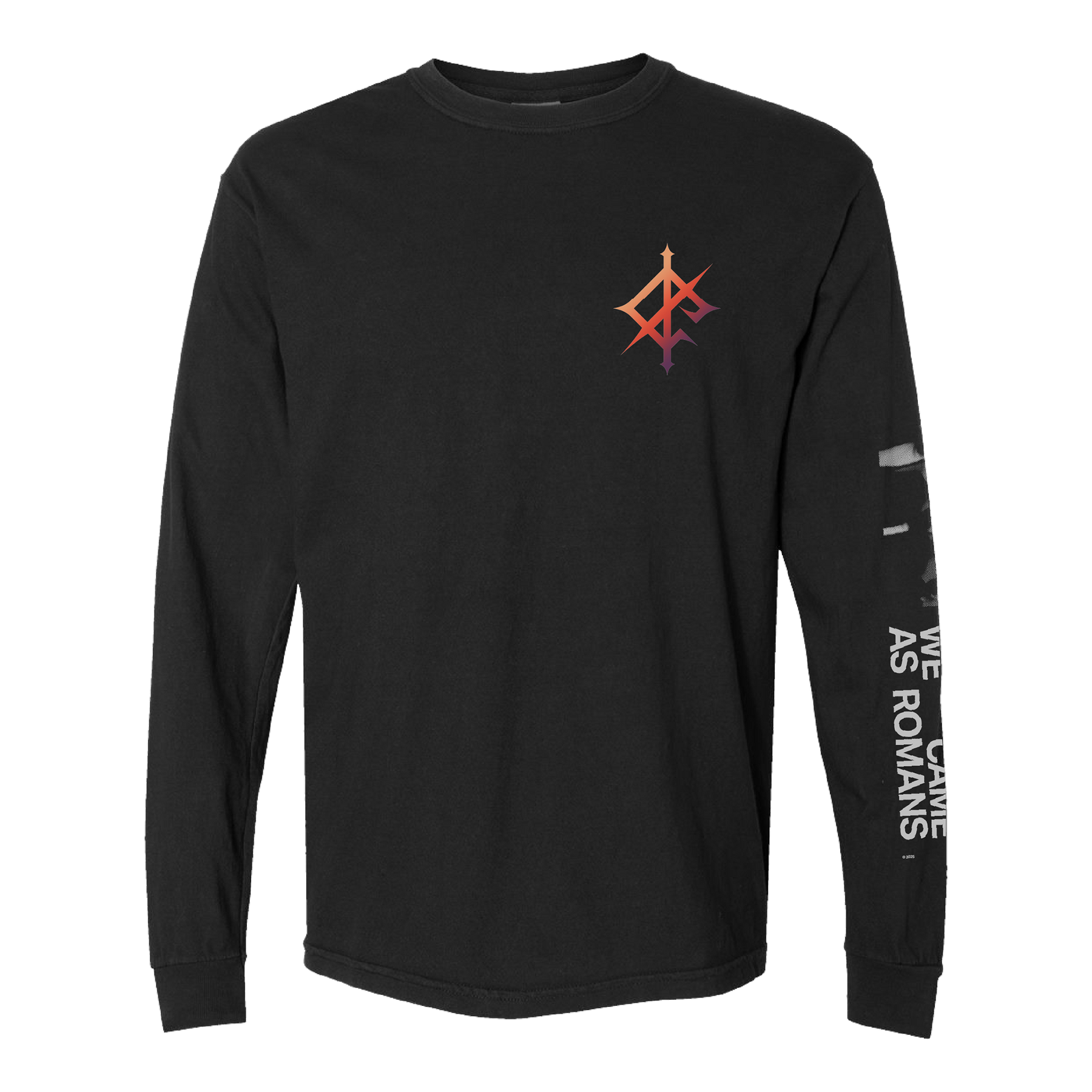 Screen printed front and back on a black 100% ring-spun cotton long sleeve t-shirt with a relaxed fit.