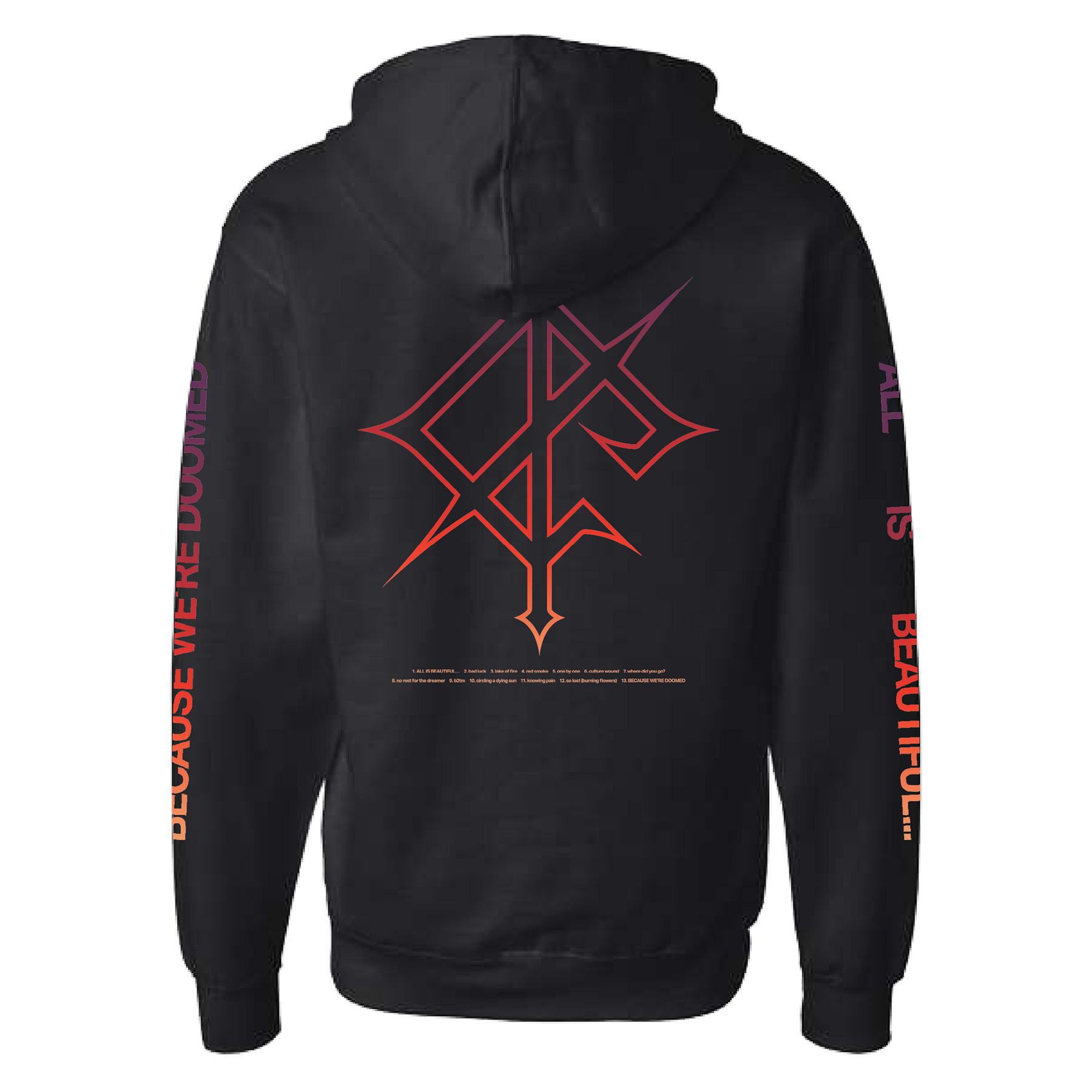 Screen printed on a black 80/20 ring-spun cotton/polyester blend fleece with 100% cotton face hoodie.